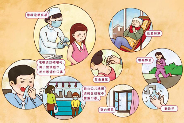 一、什么是流感? 流感,是流感病毒引起的急性呼吸道感染性疾病。流感病毒分为甲(A)、乙(B)、丙(C)三型。其中甲型流感经常发生抗原变异,传染性强,传播速度快,容易发生大范围流行,四季均可发生,以冬季为主。 二、流感和普通感冒有何区别? 三、流感如此凶险,谁是流感高危人群? 四、流感需做哪些化验? 五、你不可不知道的用药注意事项 轻型流感注意休息,对症治疗可自然痊愈。重型流感应尽早开始使用奥司他韦等抗病毒药物治疗(48小时内)。服用奥司他韦可以有效减少流感并发症,但服药期间需密切关注患者不良反应,最常见的有恶心、呕吐、腹泻等症状。在青少年中极少数还会出现幻觉、谵妄和行为异常等精神症状。 六、别担心,流感是可防可治的——中医药预防流感面对气势汹汹的流感,防治流感,中医更有招。内服中药是中医预防流感最传统、最常用的手段,不仅为公众广为接受和专家推荐,还得到政府与协会的认可和支持。流感轻症辨证治疗方案 1.风热犯卫证常用中成药:疏风解表、清热解毒类,如金花清感颗粒、连花清瘟胶囊(颗粒)、清开灵颗粒(胶囊、软胶囊、片、口服液)、疏风解毒胶囊、银翘解毒类、桑菊感冒类等。儿童可选儿童抗感颗粒、小儿豉翘清热颗粒等。 2.热毒袭肺证常用中成药:清热解毒、宣肺止咳类,如连花清瘟胶囊(颗粒)、银黄类制剂、莲花清热类制剂等。儿童可选小儿肺热咳喘颗粒(口服液)、小儿咳喘灵颗粒(口服液)、羚羊角粉冲服。 七、家庭保健,远离流感 1.佩戴中药香囊预防流感的香囊多以芳香辟秽、祛邪解毒药物为主。药物的气味通过口、鼻、肌肤毛窍等进入人体,可以疏通经络,调节气血,扶正气以抵御外邪秽气侵入。中药香囊可以降低流感患病率和平均病程,缓解发热、鼻塞流涕、咽部充血等症状,佩戴中药香囊可以起到预防保健作用。香囊使用小妙招:使用时将流感香囊放置在工作地点或卧室经常活动范围1米以内(推荐放置在办公室、床头、枕边等处),不定时嗅吸,2周或气味消失后更换中药内容物;孕产妇、婴幼儿、敏感人群慎用。 2.携带中药滴鼻剂中药滴鼻剂起效迅速、生物利用度高、副作用小及使用方便等优势,也是中药预防流感的一个重要外治方法。 3.口服中药代茶饮儿童方:大青叶3 g,薄荷1 g,生甘草3 g,芦根10 g,甜叶菊少许;成人方:大青叶6 g,炒山栀3 g,荆芥3 g,芦根10 g,生黄芪10 g 以上为一人份代茶饮,每天1~2次,每次200毫升,连用5天。 4.坚持穴位按摩每天早晚依次按摩人中穴、迎香穴、风池穴、风府穴、大椎穴、足三里穴可以缓解疲劳,预防感冒。经常熬夜、久坐的上班族还可以通过勤梳头、常揉按耳部穴位来缓解压力,疏通经络,提神醒脑。 八、预防和护理——重视流感防治,有你有我 1.预防接种接种流感疫苗是预防流感最有效的手段,可降低接种者罹患流感和发生严重并发症的风险。 2.易感人群防护在流感期间, 小儿及慢性病多的老人属于易感人群, 要避免饮食不节, 出现食滞可及时食用荸荠、萝卜类消食;注意防寒, 一旦感受寒邪及时通过推拿颈部穴位或耳穴, 以宣散头面部气血祛散寒邪。 3.一般预防措施保持良好的个人卫生习惯是预防流感等呼吸道传染病的重要手段。 文字作者:张瑞 绘图:张秋霞资料来源:中国人口出版社