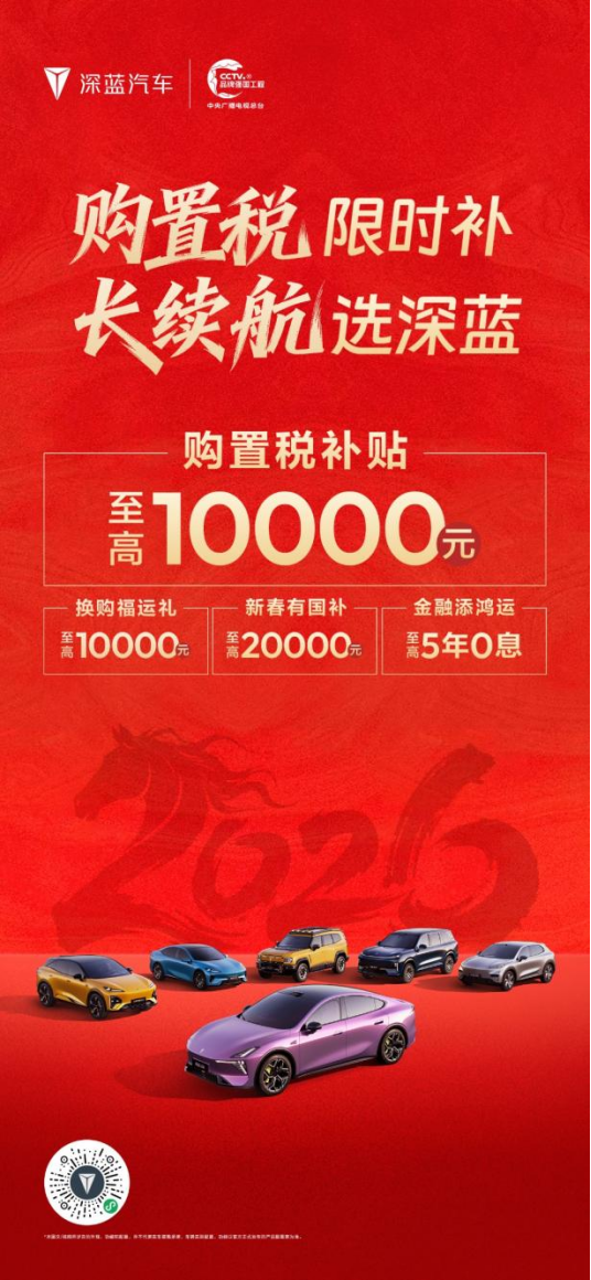 1月21日,深蓝汽车发布重磅福利。直播间深蓝高管齐送祝福,精准直击新春购车需求。围绕辅助驾驶安全、L3技术应用等用户高度关注的议题,深蓝汽车董事长邓承浩与《谭谈交通》IP主理人谭乔同框展开了深度对谈,全方位解答大家的疑问,助力每一位消费者轻松入手心仪座驾。全系通用限时福利,多重政策直击购车痛点此次发布,深蓝汽车带来四款长续航车型,覆盖科技智能中型SUV S07、长续航磁流变激光智能轿跑 L06、全球时尚电动SUV S05、科技智享中型轿车L07等完整产品矩阵,每款车型均配备专属购车政策,精准匹配不同消费群体需求。从购车用户实际需求出发,深蓝推出的购置税限时补政策诚意拉满、力度空前。购置税补贴至高10000元,换购福运礼至高10000元,新春有国补至高20000元国补红包,双重现金福利叠加。同时,推出“金融添鸿运”方案,至高可享5年0息优惠,深蓝汽车积极响应国家政策,让消费者实现“轻松购车、无忧用车”。除核心补贴外,更有多重额外福利,到店礼、试驾礼、下订礼层层加码,此时入手不仅能赶上新春出行用车节奏,更能享受实实在在的成本节省,是新春购车的最优窗口期。深蓝S07:现车充足即提即走,智驾座舱享舒适全新深蓝S07 630长续航纯电版现已全面到店,即订即提,即刻开启新春出行。新车基于对用户需求的深度洞察,以“最豪华、最舒适、最智能、最强动力”四大核心价值,重新定义智能豪华SUV标准。外观内饰采用同级领先的豪华设计,双脸造型与高亮双色车身时尚动感。车内配备10.7㎡全车软包与超纤绒感麂皮,触感细腻。前排双零重力座椅支持多向电动调节与8点按摩功能,结合20扬声器杜比音效,打造沉浸式豪华座舱。智能方面,全系标配华为乾崑ADS SE驾驶辅助系统,基于WEWA架构实现通行效率提升20%、重刹率降低70%,覆盖高速领航、城区巡航与智能泊车,并搭载全维防碰撞系统CAS 4.0与哨兵模式。座舱内置高通骁龙8295P芯片与Deepal OS 4.0系统,提供流畅智能交互。现购车可享至高7000元购置税补贴、5000元置换礼、3000元换购礼及至高19548元新春国补,另提供多种零息金融方案。深蓝S07以更高价值,满足用户对长续航与豪华出行的双重期待。深蓝L06:科技配置拉满,智能轿跑新选择自上市以来,深蓝L06凭借其“长续航磁流变激光智能轿跑”的定位,以全方位科技配置实现“入门即高配”的理念,让前沿科技服务于每一位用户的日常体验。进化不止,智能随行。深蓝L06 2026 OTA持续升级迭代,不断优化智能驾驶与座舱交互体验;搭载法拉利同款磁流变悬架,兼顾极致操控与乘坐舒适;全系标配激光雷达,采用特斯拉同款一段式端到端驾驶辅助算法,百万内唯一搭载3nm车规级座舱芯片,辅助驾驶能力与车机性能遥遥领先;全系标配金钟罩电池技术和高标准电芯,至今保持零自燃记录,安全保障拉满;纯电续航至高670km(CLTC),彻底告别续航焦虑。同时,深蓝L06以满满诚意推出多重购车福利,大幅降低智能座驾拥有门槛。消费者购车即享5000元购置税补贴、至高5000元换购福运礼、至高18228元新春国补,金融方案可享10万5年贷3年0息或8万2年贷0息。年轻消费者无需背负高额资金压力,就能轻松入手这款颜值与续航兼备的智能轿跑。深蓝S05:全球爆款时尚电动SUV,超长续航快补能2025年全年深蓝S05累计销量超13万台,连续7个月全球销量破万,单月最高突破2万台,连续3个月拿到紧凑型纯电SUV销冠。S05在海外表现也非常亮眼——泰国连续多月获得细分市场第一,深蓝S05已在全球60多个国家成功上市销售。深蓝S05拥有620km(CLTC)超长纯电续航,30%-80%快充仅需15分钟,补能效率高效便捷;全系标配Deepal AD Pro智能辅助驾驶系统,搭载宁德时代电芯+金钟罩电池,安全性能备受市场认可;全球首创微核高频脉冲加热技术,在-30℃低温环境下,电池可快速温升20℃,确保低温续航稳定;2880mm越级轴距与964mm同级领先二排腿部空间,打造出舒展宽适的驾乘感受;荣获2025德国iF设计大奖的宽体灵动造型,以全球权威认可诠释超高颜值。为回馈用户厚爱,现在下订深蓝S05,可享5000元购置税补贴、4000元超级置换礼、3000元换购福运礼、至高16908元新春国补,金融方案同样提供10万5年贷3年0息或8万2年贷0息选择。无论是首次购车还是置换升级,消费者都能享受到实打实的优惠,质价比优势突出。深蓝L07:全系标配华为乾崑智驾,科技质感全面越级作为科技智享中型轿车,纯电版续航里程至高660Km(CLTC),全系搭载宁德时代电芯+金钟罩电池,标配同级首发3C超充,SOC 30%~80%≤15min,充电10分钟,续航百公里;全系搭载华为乾崑ADS 4 SE 驾驶辅助系统,有路就能开,有位就能停,唯一支撑全向安全,20向防碰撞系统,覆盖日常高频场景,打造更智能、更安全的出行体验;同级唯一全系标配可变自适应悬架,拥有媲美豪华品牌的舒适性与操控性;云感舒享双零重力座椅,一键躺平超惬意,搭配7.3.4杜比音乐厅,带来Live House沉浸奢享体验。新春购车享钜惠,深蓝L07携多重福利诚意献礼!购车可享5000元购置税补贴,8000元超级置换礼、至高18348元的新春国补,并提供10万5年贷3年0息或8万2年贷0息的金融添鸿运。多重优惠叠加享,购车门槛直降,让消费者轻松拿下这款实力座驾!央企担当筑牢根基,暖心福利彰显责任深蓝汽车作为中国长安旗下核心新能源品牌,肩负着新能源产业升级与技术突围的重要使命,是推动新能源产业高质量发展的关键力量。此次新春