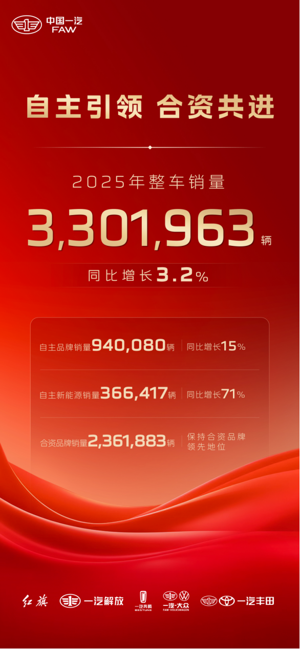 2026年1月1日,中国一汽发布2025年销量数据。2025年1-12月,中国一汽整车销量突破330.2万辆,同比增长3.2%。其中,自主品牌销量突破94万辆,同比增长15%;自主新能源销量突破36.6万辆,同比增长71.4%,增速显著;合资品牌销量236.2万辆,保持合资阵营领先地位。2025年,中国一汽坚持以科技创新为引领,深入推进“稳中快进、创新提质”总体策略,在品牌向上、技术突破、市场开拓等方面取得多项重要进展,企业高质量发展迈上新台阶。红旗品牌:创变提质,焕新前行2025年红旗品牌全年销量突破46万辆,同比增长11.7%,实现连续8年正增长,持续巩固自主豪华品牌领跑地位。其中,红旗新能源产品全年累计销量14.9万辆,同比增长29.8%,持续担当销量增长核心动能。红旗金葵花产品销量1,404辆,持续在超豪华市场打造具有东方神韵的顶级豪华体验。面对汽车产业的新格局与新挑战,一汽红旗立足品牌焕新战略核心指引,始终坚守以用户为中心的发展理念,全面推动企业内部管理、技术研发、智能制造、营销服务全体系焕新变革,以变驭变,依托IPMS模式搭建起全新的产品运营管理体系,为品牌在新发展阶段实现高质量跃升,持续注入强劲且可持续的发展动能。2025年,红旗品牌迎来历史性跨越,成为首个突破200万用户的中国豪华汽车品牌。同时,在2025年发布的《中国500最具价值品牌》分析报告中,红旗品牌以1410.65亿元的品牌价值,位列乘用车品牌行业第一。品牌持续焕新:为满足用户日益多元化的需求,红旗品牌迎来全面焕新升级,构建起“红旗”母品牌统领,“红旗、红旗天工、红旗金葵花”三大子品牌协同发展的全新体系,实现从“一本通读”到“分卷精读”的战略升级。产品持续扩容:红旗三大子品牌各展所长、协同发力,红旗H5 PHEV、红旗HS6 PHEV接连上市,将混动产品打造成新的销量基石;“红旗天工”接连推出天工08、天工05、天工06以及搭载900V高压平台技术的新车型。技术持续突破:打造天工纯电、鸿鹄混动、九章智能三大技术平台,为红旗品牌的持续跃迁打牢技术底座。营销持续创新:针对不同用户群体,匹配差异化产品,践行营销创新,以用户为中心推动品牌向新而行,为红旗未来的再次跃迁提供驱动力。站在200万用户的新起点,红旗品牌正以清晰的品牌架构、坚实的技术平台和精准的产品布局,在传承与创新中,走出一条独具特色的中国高端汽车品牌发展之路。解放品牌:创新驱动擘画新篇,全球布局引领未来2025年,面对深度调整、快速转型的行业变局,“解放”品牌价值突破1450亿,连续十四年行业第一,创新指数连续八年行业第一;全年销售整车突破28万辆,中重卡销售25.5万辆,终端份额稳居国内第一,新能源跃居行业第一,海外实现六年十倍跃迁增长。国内市场持续领跑。在国内市场,一汽解放连续多年实现销量领跑,中重卡终端份额始终稳居国内第一。秉持着布局应变局、创新求突破、转型谋发展的理念。密集推出多款重磅产品,相继投放“鹰阵”系列产品、J6G pro产品、T-shift AMT等重点产品,为用户创造更安全、更便捷、更美好的智慧出行体验。在新能源领域,发布“蓝途3.0”平台新能源产品,全力支撑国家“双碳”目标达成。在质量领域,一汽解放荣获中国质量奖提名奖,6DV超级工厂入选工信部卓越级智能工厂,整车平均首次故障里程提升16%,用户满意度显著提升。同时,一汽解放始终坚持“以用户为中心”,倾力打造多项用户权益,致力于打造一个让客户倍感温暖的生态圈,更好的为广大用户提供“中国第一、世界一流”的绿色智能交通运输解决方案。国际市场加速拓展。在国外市场,一汽解放销量首次突破6万大关,实现六年十倍销量跃迁,其中东南亚、西亚、东南非、南非同比增长超50%,西北非大区增长达277.2%。解放品牌秉承“生而全球”理念,以属地化运营深度融入全球市场,率先落地运营沙特子公司,统筹推动8家海外子公司成立。在刚刚结束的全球合作伙伴大会上,解放品牌发布了五大海外产品品牌和DQ、DM等全新海外产品,彰显持续深化布局全球化业务的坚定信心。目前,一汽解放海外业务已拓展至全球105个国家,持续推动建设“全球一张网”和“四大平台”,提升资源协同和一体化管理能力,进一步构建起海外核心竞争优势,让解放品牌成为全球市场备受信赖的“中国名片”。奔腾品牌:双驱发力,再创新高2025年一汽奔腾延续增长势能,1-12月品牌销量200017辆,同比增长33%,创品牌成立20年来新高。其中新能源1-12月销量171957辆,同比提升107%,“All in 新能源”战略转型成功完成。在国内市场持续发力和海外布局加速突破的双重驱动下,奔腾品牌焕发出“向新”活力。 在国内市场,一汽奔腾完成股权多元化改革,成功引入多家战略投资者,落地85.5亿元增资,构建起“央企资本+地方战投+产业伙伴+技术龙头”的股东格局。全新新能源序列“悦意”正式发布,为“品智悦享家”而来,以品质好车诠释“为生活,添悦意”的价值主张。悦意序列旗下“双子星”悦意03、悦意07锚定家庭用户全场景出行需求,致力于让高品质新能源体验触手可及。奔腾小马精致焕新,在社交媒体上“破圈”传播,成为年度人气精品车。 在海外市场,一汽奔腾国际公司成立并独立运营,积极响应“一带一路”倡议,聚焦东欧及海湾等重点市场,推动产品、技术与品牌实现从“走出去”到“走进去”的跨越,加速完善全球化战略
