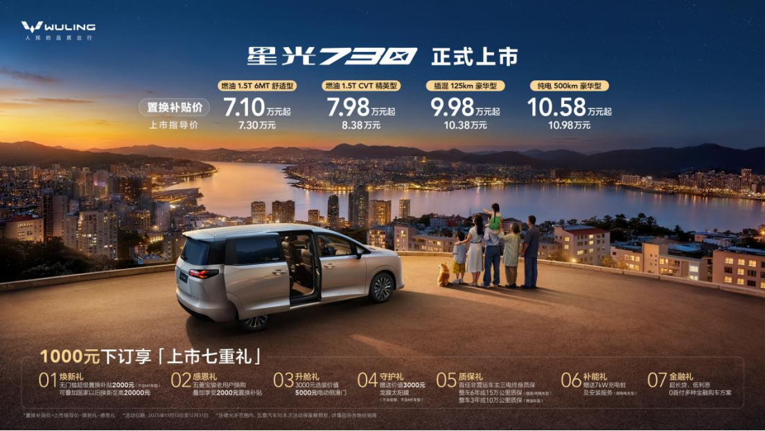 2025年11月12日,「全能舒享大7座」星光730正式上市,一门开万家,为千万中国家庭开启万种幸福可能。新车共推出四款车型配置:燃油1.5T 6MT舒适型、燃油1.5T CVT精英型、插混125km豪华型、纯电500km豪华型,上市指导价分别为7.30万元、8.38万元、10.38万元、10.98万元,更有置换补贴价7.10万元-10.58万元起。自2025年11月12日起至12月31日,在五菱汽车APP/小程序等官方渠道,1000元下订享「上市七重礼」,包括:1、焕新礼:无门槛超级置换补贴2000元(不含MT车型),可叠加国家以旧换新至高20000元;2、感恩礼:五菱宝骏老用户换购叠加享受2000元置换补贴;3、升舱礼:3000元选装价值5000元电动侧滑门;4、守护礼:赠送价值3000元龙膜太阳膜(不含安装,不含MT车型);5、 质保礼:首任非营运车主三电终身质保,整车6年或15万公里质保(插混/纯电车型),整车3年或10万公里质保(燃油车型);6、补能礼:赠送7kW充电桩及安装服务(限纯电车型);7、金融礼:超长贷、低利息、0首付多种金融购车方案。星光730承载五菱对新时代家庭出行的全新思考,全系标配超过50项品质配置,树立起“新空间、新科技、新动力、新底盘、新研发、新智造”六大家用MPV黄金标准,空间、舒适、安全和细节一步到位,为人民交出一份全家人都满意的新答卷。800万+用户信任背书,打造新时代MPV六大全新黄金标准五菱始终坚持“人民需要什么,五菱就造什么”。自2010年首款五菱宏光上市以来,五菱持续深耕MPV市场,每款产品都精准契合时代家庭的用车需求,持续推动中国家庭出行品质升级,累计销量突破800万辆,成为行业首个达成这一成就的中国汽车品牌。为适应新时代家庭出行需求,五菱以“新空间、新科技、新动力、新底盘、新研发、新智造”六大全新黄金标准,打造新时代人民的MPV。星光730拥有同级最大“新空间”和同级唯一的电滑门“新科技”,并搭载同级唯一的一车三动力,以“新动力”满足多元出行选择;采用前后双独悬的“新底盘”,让好开和舒适可以兼得。五菱还持续推进“新研发”,打造“天”“灵”“神”三大系列自主科技,结合全球领先的智能岛制造体系(I²MS),以国际领先的“新智造”实力,为星光730带来值得信赖的品质保障。在发布会现场,五菱品牌挚友王祖蓝与李亚男夫妇作为“品质见证官”出席,结合其家庭亲子出行需求,分享了星光730的深度体验感受,充分印证了其产品魅力。现场更通过“空间挑战”等趣味环节,验证新车的硬核产品实力。全能舒享一步到位,星光730成家庭出行最优解星光730预售即爆款,累计大订订单已突破30000台,为广大家庭兑现“全能舒享”的承诺。作为10万级MPV中唯一可配备电滑门的车型,星光730上下更方便,无需担心车门占用横向空间,狭窄车位不剐蹭,停车避免“开门杀”;标配B柱辅助关爱拉手,老人、小孩上下车可轻松借力,更显便利和安全。真7座“不将就”,每个人都是VIP。星光730的内部座舱空间最长达3331mm,横向肩部宽度最大达1500mm,第三排地面到顶棚高度超1.2米,给用户带来越级大空间,无论坐在哪一排,都能自由伸腿不憋屈,久坐不累很舒适。第三排座椅还采用魔术翻折设计,通过全放倒并向前翻折,可带来最大容积1202L的百变后备厢,能装、易装又好装,坐满一家七口的同时,也能轻松放置七人行李。一车三动力,满足全场景出行需求。星光730插混版适用多口之家、精打细算的务实家庭,兼顾全家长途出游和日常短途通勤,省油省电更全能。在灵犀动力3.0技术加持下,星光730插混版拥有“超省、超强、超顺、超可靠”的动力体验,满油满电综合续航可达1100km,亏电油耗仅5.3L/100km,成功斩获“2025年度中国心十佳发动机及混动系统”(同级唯一)、“中汽中心高品质混动认证”两项大奖;纯电版拥有同级最低的0.276Cd整车低风阻设计,CLTC续航可达500km,电耗13.6kW·h/100km,并支持2C快充,从30%补能到80%仅需20分钟,适用城镇上班族、固定跑车、追求经济与舒享的家庭;燃油版品质靠谱、皮实耐用,提供CVT和6MT可选,搭载同级领先的1.5T高扭矩发动机,采用缸内直喷技术,最大扭矩至高可达290N·m,爬坡动力澎湃且高效节能,适用追求经济但充电不便的大家庭,也能兼顾个体经营和家庭创富的需求。安全0焦虑,让家庭出行倍感安心。星光730搭载六环高强钢笼式车身,前后防撞梁标配吸能盒,并采用“碰撞后发动机下沉技术”,可在正面碰撞时通过预设的机械结构,使发动机整体向下“掉落”为驾驶员预留生存空间,小概率危险也能做好提前防护;加之提前满足2026年新国标的神炼电池,300万新能源销量依然保持“碰撞0自燃”记录,为家人筑起坚不可摧的安全屏障。作为超800万用户的信赖之选,星光730延续“国民神车”基因,用一步到位的诚意,满足每一个家庭的期待。新车已全面上市,欢迎用户到店体验。