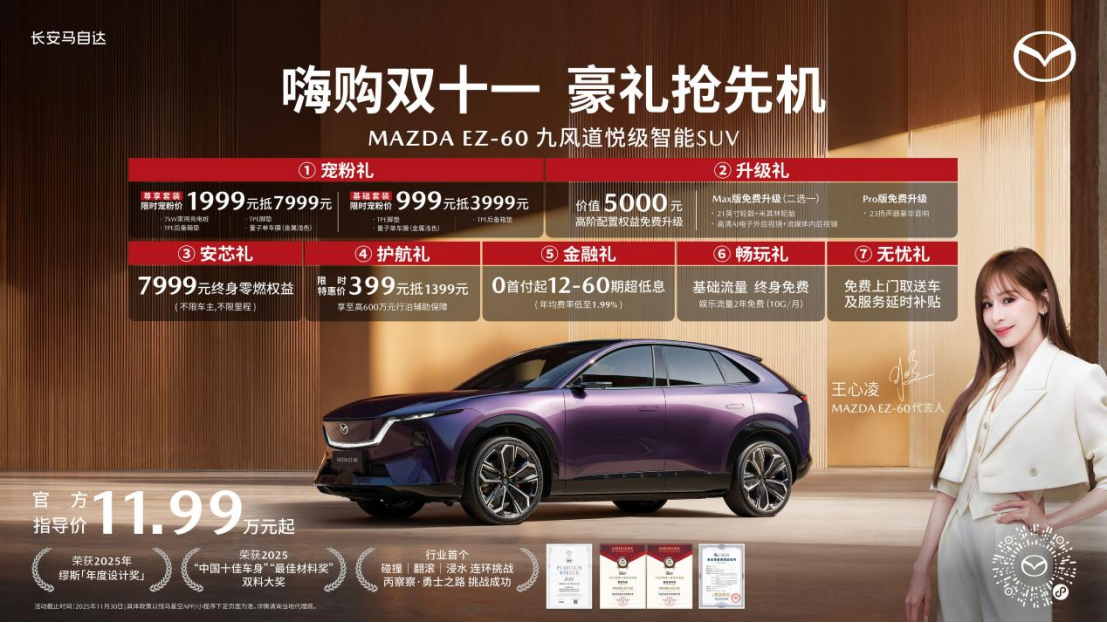 2025年,长安马自达以“用户盛典”为纽带,持续深化新能源转型步伐。自4月发布「双白翻番」战略以来,品牌在技术与用户运营两端齐头发力,旗下两款新能源车型——EZ-60与EZ-6,凭借极具竞争力的价格、扎实的安全实力与丰富的用户权益,迅速成为市场焦点。EZ-60:设计、安全、智能全面突破,树立中型SUV价值标杆 作为马自达百年造车技术的集大成者,MAZDA EZ-60定位“全球化新能源中型SUV”,推出纯电与增程双动力共6款配置,官方指导价为11.99万-16.09万元。新车不仅以“星云紫”“水天蓝”等7款色彩满足多元审美,更在设计、安全与智能方面斩获多项权威认可:先后荣获缪斯设计奖·铂金奖、“2025中国十佳车身”及“最佳材料奖”,并成功在“丙察察”极端路况完成行业首次碰撞-翻滚-浸水连环安全挑战,获颁“TOP Safety”顶级安全认证。 EZ-60还搭载多项全球与同级首发科技,兼顾美学与实用。其“九风道”空气动力学设计有效降低风阻与能耗,提升续航与静谧表现。配合MAX版与Pro版分别提供的高阶配置升级礼——如21英寸轮毂套装、23扬声器豪华音响等,进一步强化了产品吸引力。EZ-6:官降焕新,安全标杆再树合资B级轿车新典范 11月起,MAZDA EZ-6全系官方价格调整为11.98万元起,进一步夯实“合资新能源B级轿车价值标杆”定位。该车以“同级唯一双动力+双一流安全”为核心优势,接连斩获C-NCAP五星安全评级、中保研(C-IASI)三项全优评价、Euro NCAP双93%高分及“TOP Safety”001号证书,构筑起覆盖全球四大权威机构认证的安全体系。 用户礼遇持续加码,助力“人马一体”驶入千家万户 即日起至12月31日,用户购EZ-60可享多重权益,包括999元抵3999元基础套装、1999元尊享充电套装,以及MAX/Pro版专属升级礼。金融方面提供0首付起、年均费率低至1.99%的灵活方案,并赠送终身零燃保障、高额驾驶辅助险与流量礼包,覆盖购车、用车全周期。EZ-6同步推出置换国补20,000元、厂补5,000元及同款金融政策,进一步减轻用户拥车门槛。从产品到品牌:实力获央视背书,用户口碑持续积淀 今年10月,央视《超级生产线》栏目走进长安马自达南京超级工厂,解析EZ-60全球品质背后的智造体系;而王心凌出任EZ-60产品代言人并成为车主,更强化了品牌在国民审美与情感层面的共鸣。 随着EZ-60上市4天即登顶合资新能源中型SUV销量榜首,以及真实用户“车毁人安”的安全口碑传播,长安马自达正以扎实产品力与真诚用户政策,在中国新能源赛道上稳步向前。