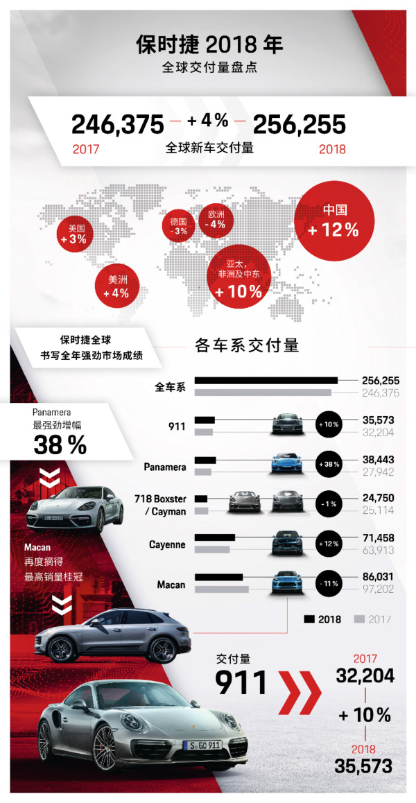 上海/斯图加特。2018 是保时捷全球的又一个创纪录年:这一总部位于德国斯图加特的跑车制造商 2018 年全球销量再创新高,新车交付量达 256,255 台,同比增长 4%。就车型而言,Panamera 以 38% 的同比增长成为增势最强劲车型,实现新车交付量 38,443 台。标杆车型 911 亦实现了双位数增长,新车交付量 35,573 台,同比增长10%。“911 车型的魅力与日俱增,”负责销售与市场的保时捷全球执行董事会成员冯佩德先生(Mr. Detlev von Platen)表示。“我们刚刚在年末的洛杉矶车展前夕庆祝了全新 911 的首秀,同时跑车标杆第七代 911 在 2018 年再次超越自我,获得了更多消费者的青睐。”时尚运动 SUV 先锋Macan凭借86,031台的全球交付量,卫冕保时捷最畅销车型,Cayenne以71,458台的新车交付量紧随其后。中国蝉联保时捷全球最大单一市场中国市场 2018 年再次成为保时捷全球销量翘楚,新车交付量达 80,108 台,同比增长 12%;美国以 57,202 台的新车交付量位居第二,同比增长3%。欧洲新车交付量同比略微下降。“调整适应新版全球统一轻型车辆测试程序(WLTP)的测试周期以及加装汽油微粒过滤器,使我们在 2018 年第四季度面临重大挑战,同时这一影响将持续至 2019 年上半年。除此之外,我们在 2018 年 2 月就已停止销售柴油机车型,” 冯佩德先生(Mr. Detlev von Platen)补充道。