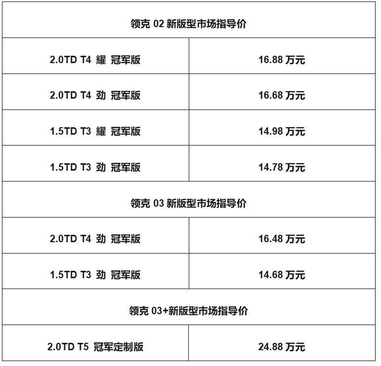 此次上市的新版型中,领克02冠军版涵盖劲、耀两种风格不同配置4款车型;领克03冠军版则涵盖劲风格不同配置2款车型。与此同时,基于消费者的强烈诉求,领克03+新增冠军定制版,全车采用尽显赛道冠军气质的哑光灰配色,并于8月12日20:03至8月15日20:03期间开启众筹,如果订单超过30台,将达成众筹条件,领克将根据订单排产,首批开放销售数量50台。