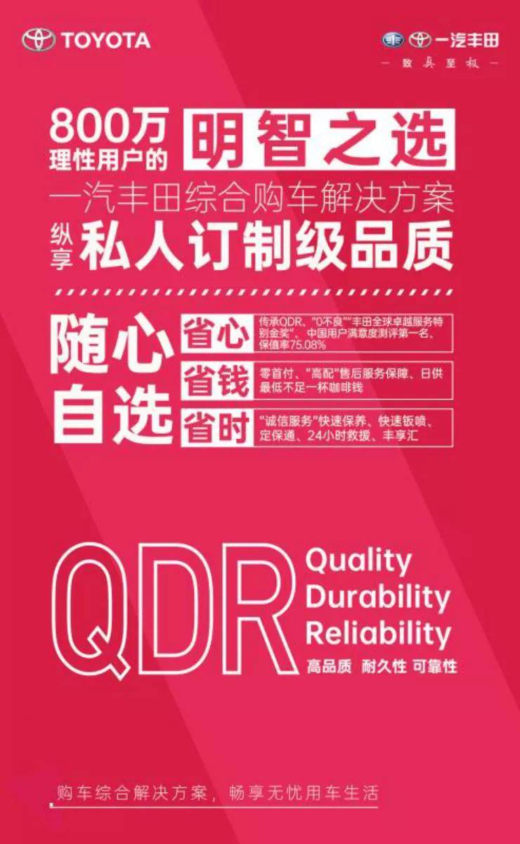 提到品质追求,就不得不提起丰田的QDR生产标准。丰田汽车“总舵手”丰田章男曾说过,丰田并不是产品线最多的品牌,但是丰田是最看重产品质量与可靠性的企业。而他一直挂在嘴边的QDR,也就是代表丰田品牌形象的高品质(Quality)、高可靠性(Durability)、高耐用度(Reliability)。得益于坚持QDR的严格标准,让丰田汽车一直屹立于全球汽车界领先位置。事实上,一汽丰田也一直坚持贯彻这一标准,保证产品从开发之初到生产、制造以及品控方面都做到精益求精。