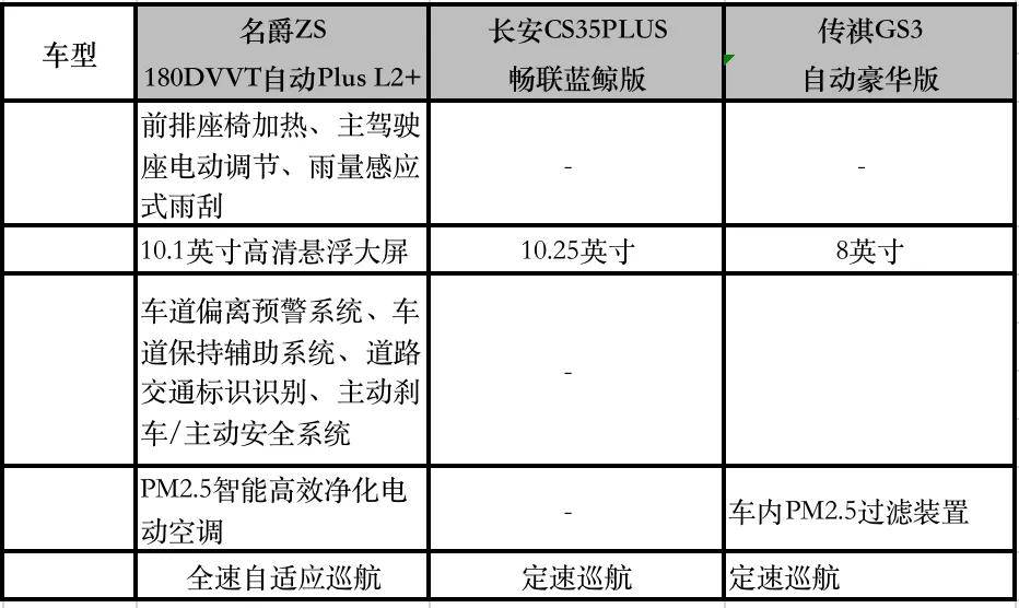 长安CS35 PLUS的内饰多采用曲线勾勒,加上贯穿式的中控屏幕,整体造型偏向于优雅风格。而传祺GS3的内饰风格则有点老气,毕竟矩形的元素已经不是当下汽车的主流设计风格。值得一提的是,长安CS35 PLUS与传祺GS3的舒适性配置远不如名爵ZS,具体舒适性配置的差异,上述表格已经有直观体现。