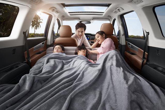 二胎家庭出游,空间必须够大。海马7X拥有4815*1874*1720 mm的大身材和2860 mm的超长轴距,宽敞的内部空间,让大家庭出行不再捉襟见肘。海马7X前排放倒变沙发,后排平放双人床。第一排座椅向后90°推平连接第二排座椅,秒变"沙发双人床"老婆孩子都喜欢,第二、三排座椅则可以向前90°推平,形成超大空间的休闲区,铺上床垫和玩具,还可转换为旅途中的"儿童房"。