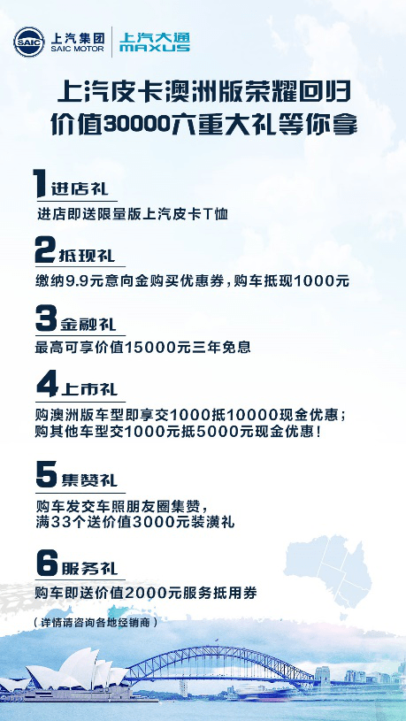 此次,上汽大通MAXUS为购买上汽大通皮卡的用户准备了诸多购车优惠大礼包,并惠及全系皮卡车型,购车惊喜礼包最高可达3万元。6重大礼包括金融礼(最高享价值15000元三年免息)、上市礼(最高享交1000元抵10000元现金优惠)、集赞礼(在朋友圈发布交车照并集赞,积满33个赞享价值3000元装潢礼)、服务礼(购车享价值2000元服务抵用券)、抵现礼(支付9.9元意向金购买优惠券,购车可抵现1000元)以及进店礼(进店即享限量版上汽大通MAXUS皮卡T恤),为消费者打造既放心又舒心的购车体验。