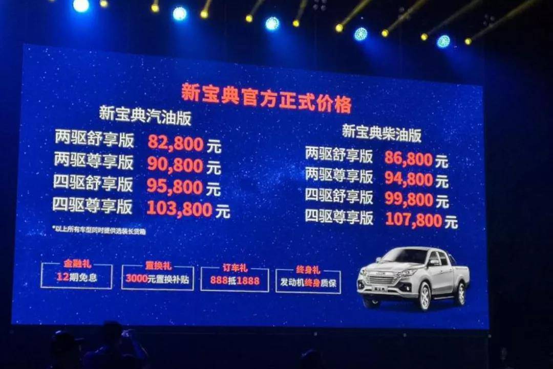 2020款江铃宝典正式上市。新车共推出16款车型,售价区间为8.28-10.93万元。江铃新宝典是一款基于域虎3打造的皮卡车型,新车提供了舒享版/尊享版两个配置,另外搭配两驱/四驱以及2.5T柴油/1.8T汽油各种组合。