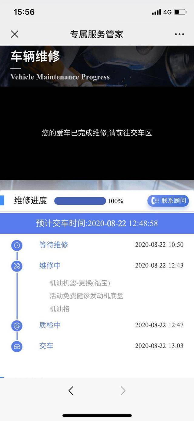 别人驾驶你的爱车,不放心?你可以打开短信链接,实时关注爱车动向。安全到达4S店后,服务顾问也会通过电话为你清晰解释每一项维修保养项目对应的时间、效果。服务结束后,你只需要通过二维码远程付款即可。随后服务人员会按照预定路线,将爱车送回指定地点,并与你再次确认车辆状态。直到保养完成,可能你的一顿火锅还没有吃完。