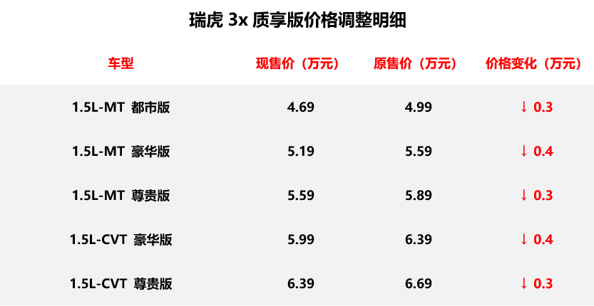 调整后的瑞虎3x质享版价格区间为4.69-6.39万,各款车型较原来降低了3000-4000元,此外,版型由原来的6款车型调整至5款车型。