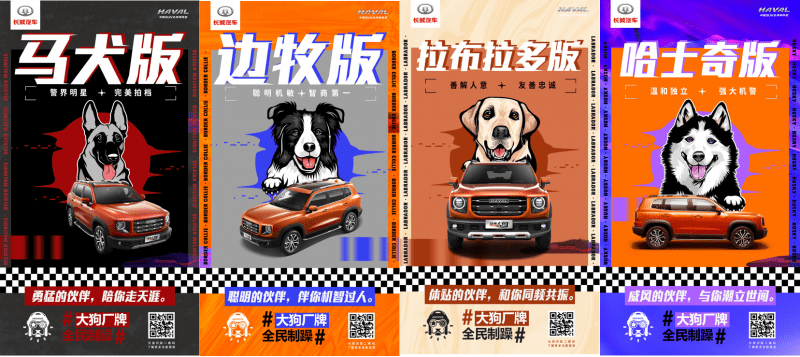 今年6月哈弗大狗开启“大狗养成模式”粉丝营销互动,首开汽车圈“一字万金”全球征名活动先河。得益于超高的关注度和诚意十足的“一字万金”奖励机制,哈弗大狗全球征名活动吸引了海内外众多网友粉丝的参与和支持。延续全球征名热度,继续大狗养成模式,近日哈弗大狗开启了“潮配你做主!大狗配置名称全球命名票选“互动,再次邀约网友粉丝行使为大狗做主的权利,为中意的哈弗大狗配置名称投票。最终马犬版3806票、边牧版3745票、拉布拉多版3665票、哈士奇版3106票,4大猛宠以绝对领先的优势胜出,成为哈弗大狗配置版型名称。