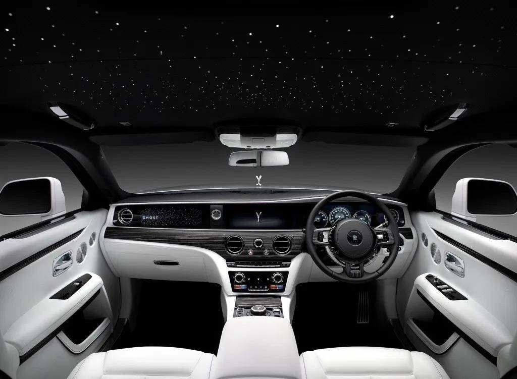 新车在副驾驶前方增加独有的星光饰板,以850颗星星环绕散发亮光的“Ghost”车名,该设计位于副驾驶座位前的中控饰板,且只有在车辆启动时,发光的星簇及字标才全然可见。