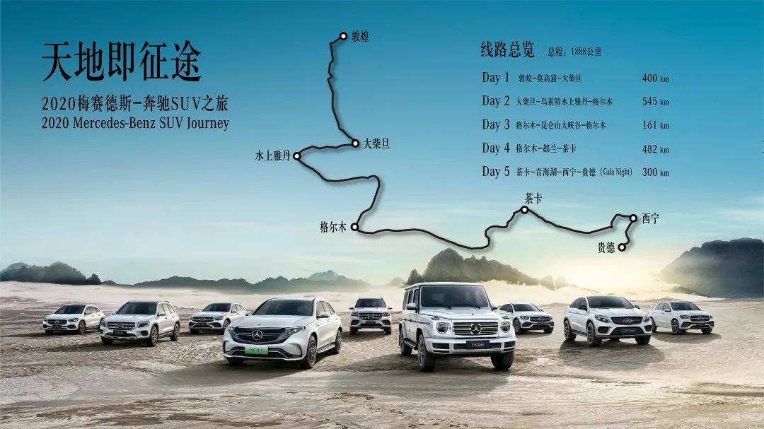 在盛典最终篇“阳关·守护之路”里,梅赛德斯-奔驰SUV家族成员集合亮相,正式启动以“守护心中天地”为主题的“天地即征途”2020梅赛德斯-奔驰SUV之旅。由新G 350、全新GLASUV、GLB SUV、长轴距 GLCSUV、GLE SUV、GLS SUV、EQC纯电SUV、腾势X插电式混动SUV等79台车组成的战队,将从丝路明珠敦煌启程,到访地质瑰宝水上雅丹,探秘自然传奇昆仑峡谷,打卡“天空之境”茶卡盐湖,最后抵达烟波浩渺的青海湖,全程共计行驶1888公里。无论在飞沙走石的大漠戈壁,还是在鬼斧神工的天然峡谷,亦或在迂回曲折的高原公路,梅赛德斯-奔驰SUV家族都游刃有余,尽显强大的产品实力。