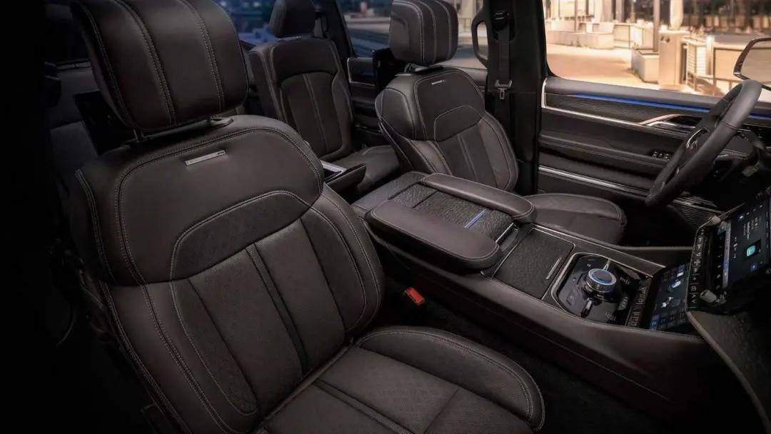 作为一款纯正的美式全尺寸SUV,这款车采用了7座布局,后排乘客也被照顾得十分到位,比如后排中央扶手提供10.3英寸的触控屏,可以调节座椅、坐姿等信息,而后排影音系统也包含了2块10.1英寸显示屏。