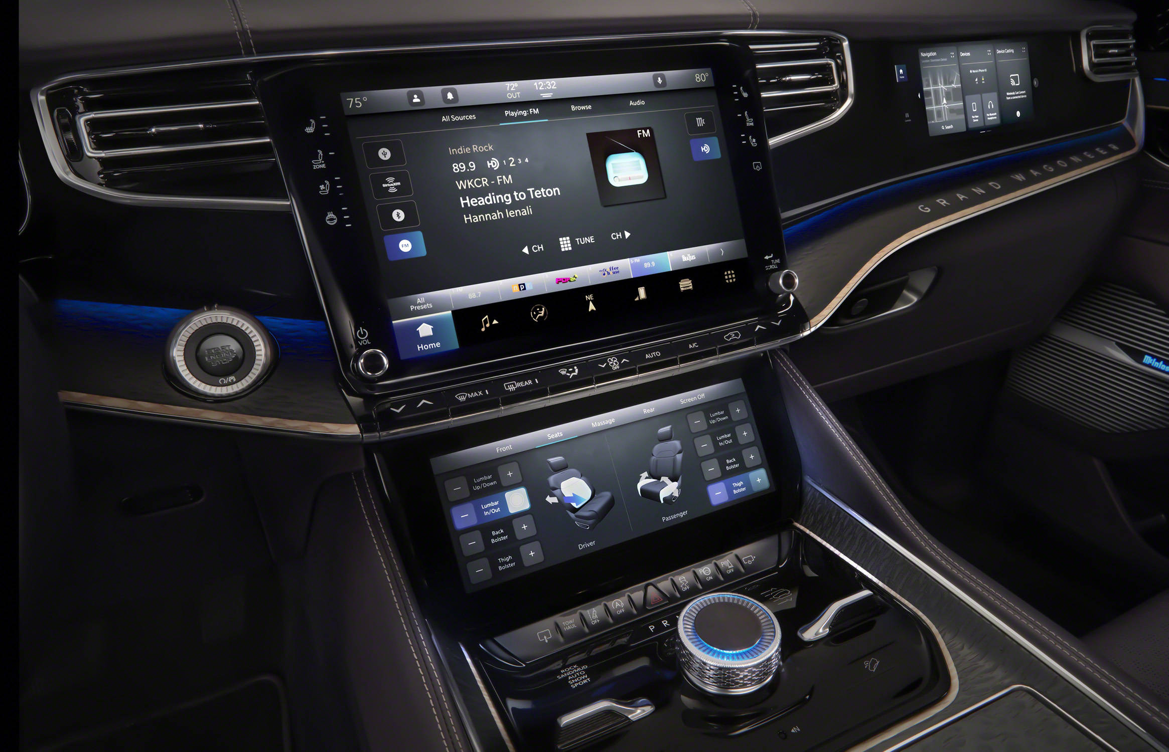 Grand Wagoneer概念车是全球唯一配备麦景图(McIntosh)车载音响的车型。麦景图是世界知名豪华音响品牌,旗下出众的家庭音响系统带来卓越的影音体验。Grand Wagoneer概念车所搭载的音响系统配备了23个定制化扬声器,与24声道功放设备互连,为用户奉上沉浸式的听觉享受。音响组件采用铝材和亮黑配色,延续麦景图高端家庭音响产品的美学设计风格。