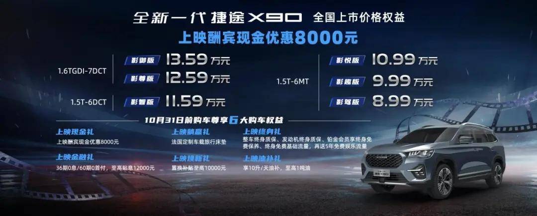 全新一代捷途X90,官方的指导售价区间为8.99万元-13.59万元。不过,在今年10月31日前购车可享受官方提供的6大购车权益。