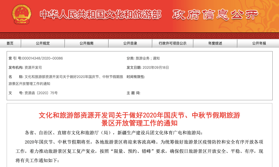 文化和旅游部18日晚间发布公告,要统筹做好国庆节、中秋节假期旅游景区疫情防控和安全有序开放工作,推动旅游景区复工复产复业,景区接待游客量可上调至最大承载量的75%。