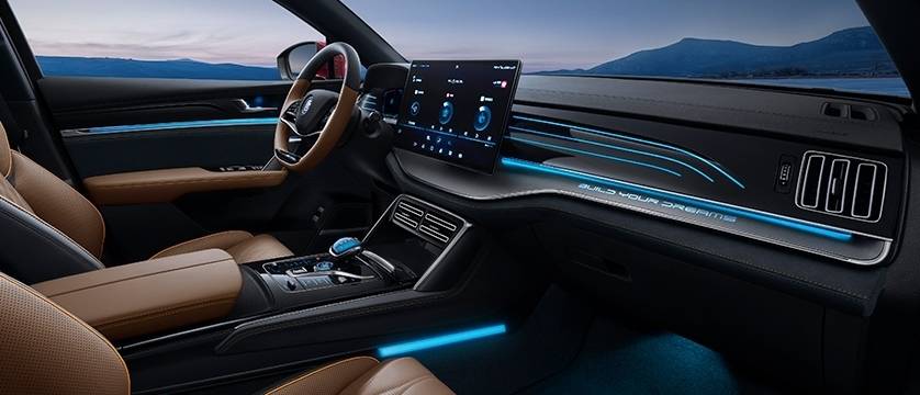 面板及全液晶仪表盘两边采用一体式的龙爪之痕氛围灯设计,金属质感的银白色哑光电镀,龙须式中饰条及高亮黑的钢琴烤漆数字化面板带给人更细腻的体验。