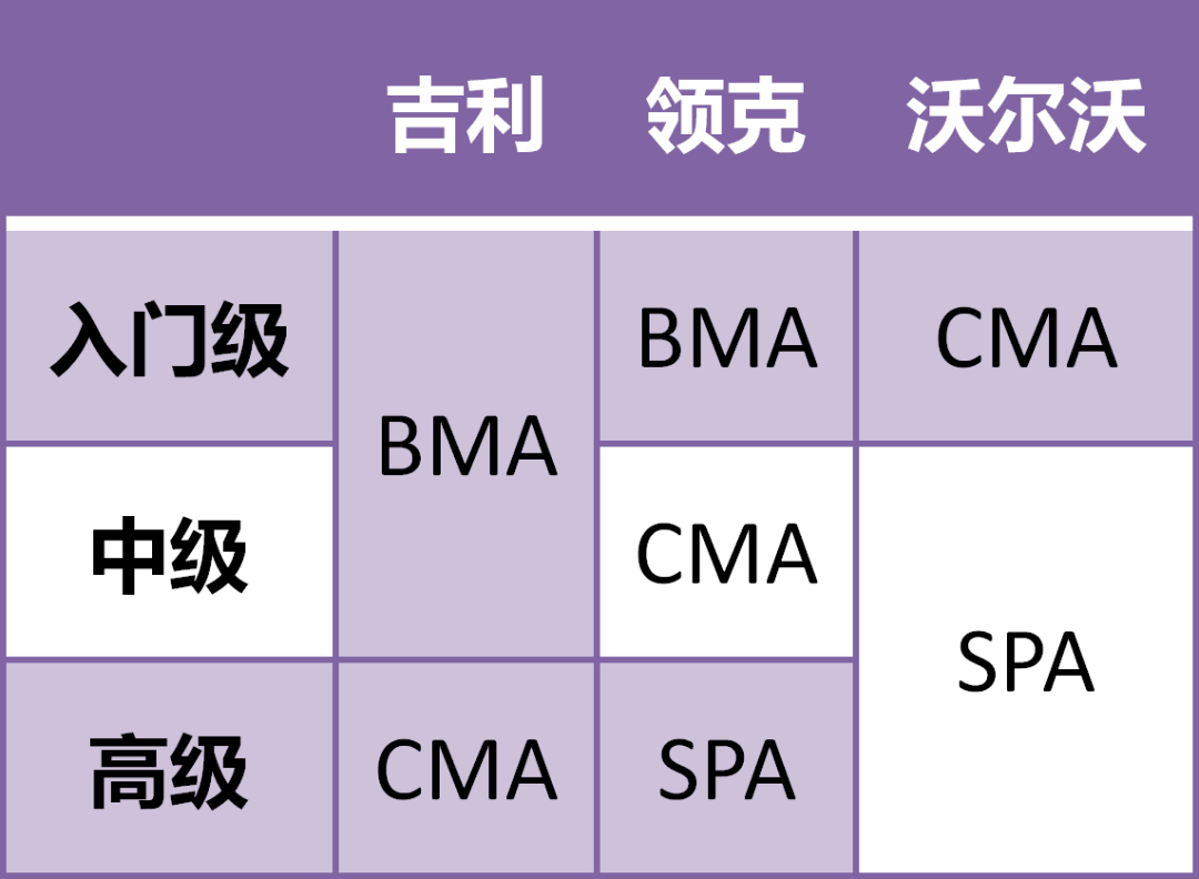 这也印证了我们一直以来的推测,也就是在吉利集团里面,BMA、CMA和SPA三大架构或平台,将分别在吉利、领克和沃尔沃上有着不同的定位。