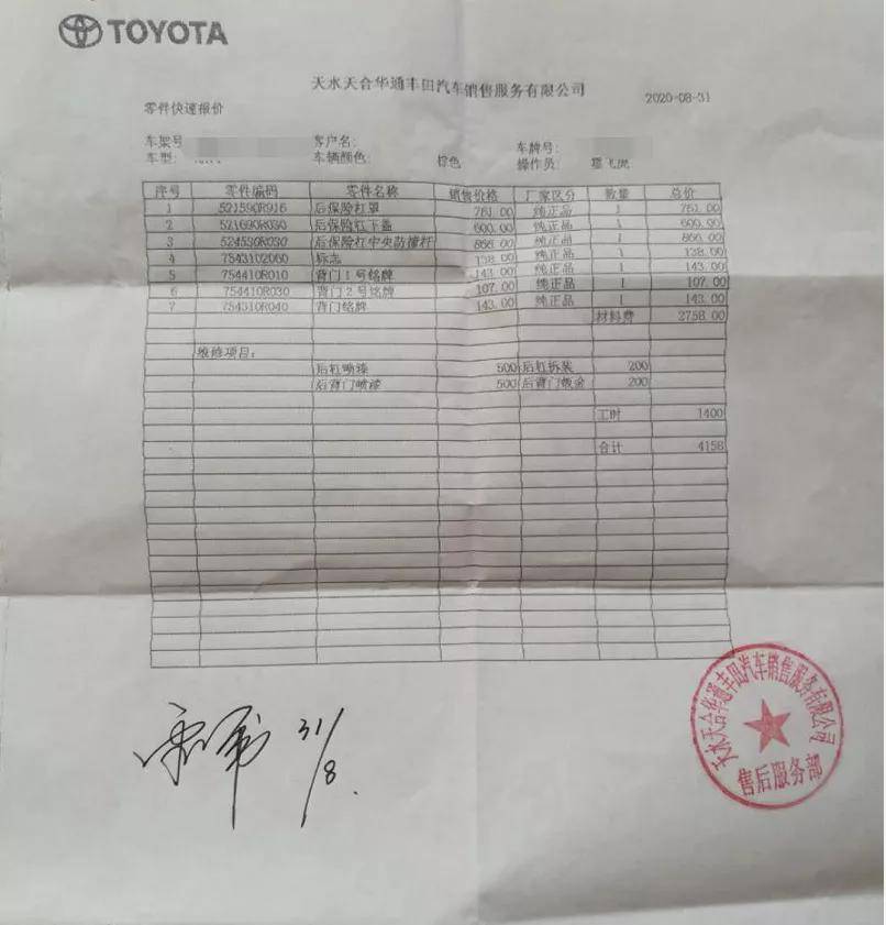 随后我们便前往4S店进行维修,所有维修项目报价共计4158元,这也就意味着后车驾驶员需要自行承担2000多元的赔偿。但对方认为4S店价格偏高,不愿进行赔偿,只愿意赔偿1000元,期间多次沟通均没有效果。