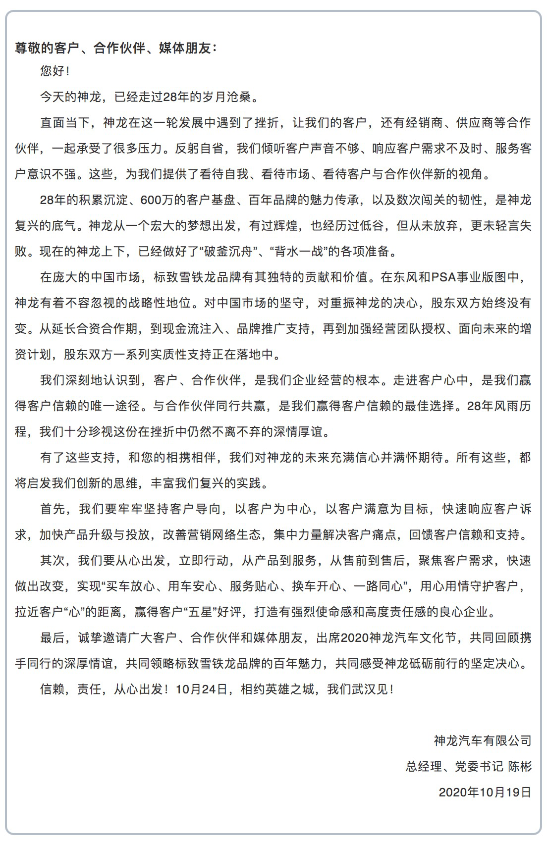 10月19日,神龙汽车有限公司总经理、党委书记陈彬在对外发出的一封公开信中指出,东风和PSA事业版图中,神龙汽车有着不容忽视的战略性地位。股东双方始终没有改变对中国市场的坚守、对重振神龙的决心。从延长合资合作期,到现金流注入、品牌推广支持,再到加强经营团队授权、面向未来的增资计划,股东双方一系列实质性支持正在落地中。