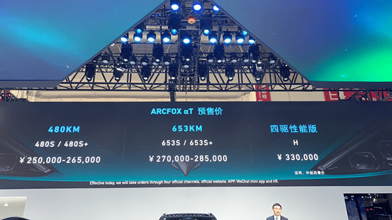 ARCFOX极狐旗下全新纯电动中型SUV——αT将于10月24日正式上市。新车已于此前开启预售,预售价区间为25.00-33.00万元。据了解,αT是ARCFOX ECF概念车的量产版,是ARCFOX旗下的第一款产品,主打中高端市场。搭载了一套双电机四驱系统,前、后电机的最大功率均为218马力,峰值扭矩为360牛·米。动力电池方面,新车采用的是由韩国SK制造的电池组,并提供67kWh和93.6KWh两种容量的电池包,对应NEDC工况下的续航里程分别为480km和653km。