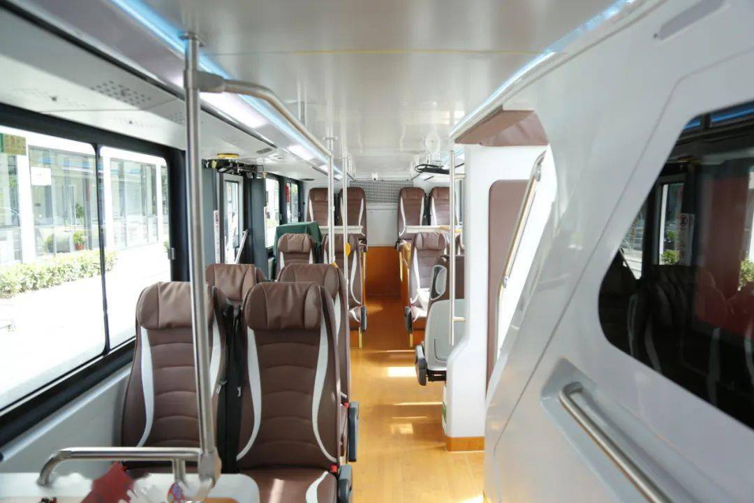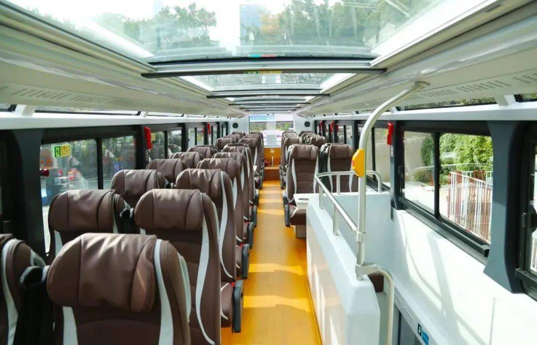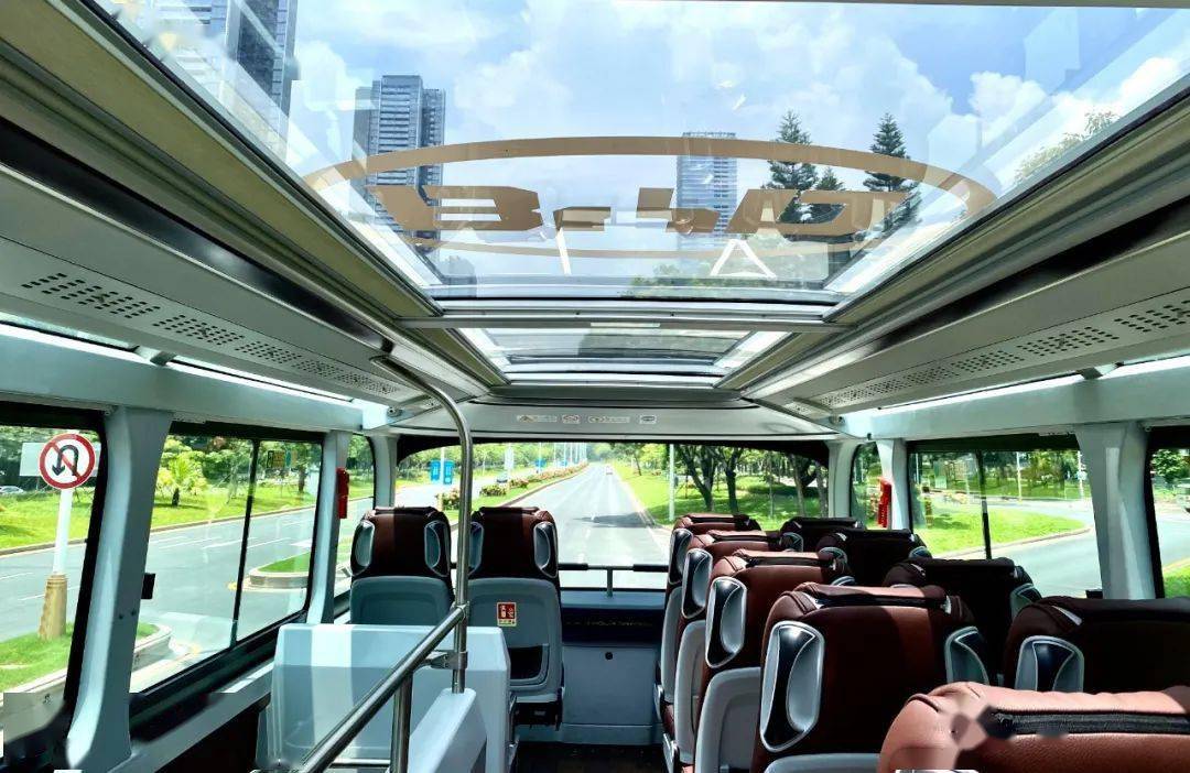 此外,为更好享受旅途风光,车辆车身设计时就为窗户预留出更大空间,辅以黑色窗框的精细拼合,提升整车透光度,更加 宽敞明亮;二层的 1.1米超级全景天窗, 两侧视窗大面积分布,让乘客观光视野更开阔,坐在大巴车内就可观赏城市的大好风光。同时,车内引入 全息沉浸式投影技术,搭载 360度全景摄像、5G+VR等科技设备,提供 中英日法等8种语言播报,为各方来宾全面升级观光体验。