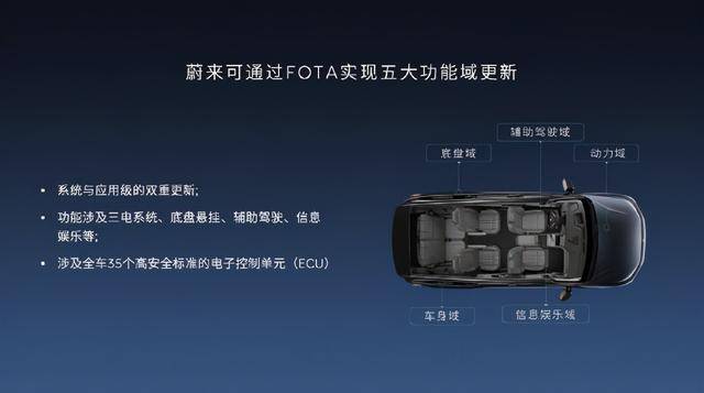 蔚来是全球首个通过完全自主研发实现了大规模整车FOTA的汽车品牌。与市场上大多数仅支持升级UI界面、导航地图和影音娱乐系统的远程软件升级相比,蔚来FOTA依靠自主研发的核心域控制器,可以对整车35个电子控制单元(ECU)实行固件升级,进行包括对动力域、底盘域、辅助驾驶域、信息娱乐域和车身域在内的重大功能。