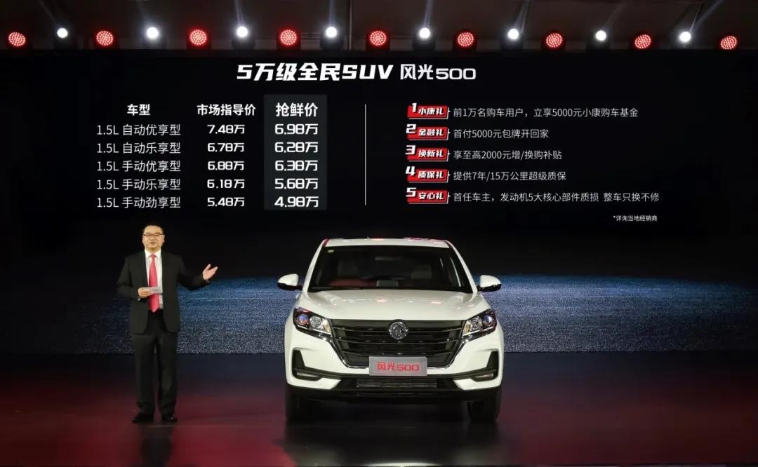 东风风光500上市的全系售价是5.48万-7.48万元,新车搭载新一代1.5L高效发动机,变速箱有5挡手动、CVT自动两种选择,共有手动劲享型、手动乐享型、手动优享型、自动乐享型、自动优享型五款配置,并为诸多购车用户提供5000元小康购车基金、金融置换补贴、发动机5大件质损换车承诺等多重购车福利。