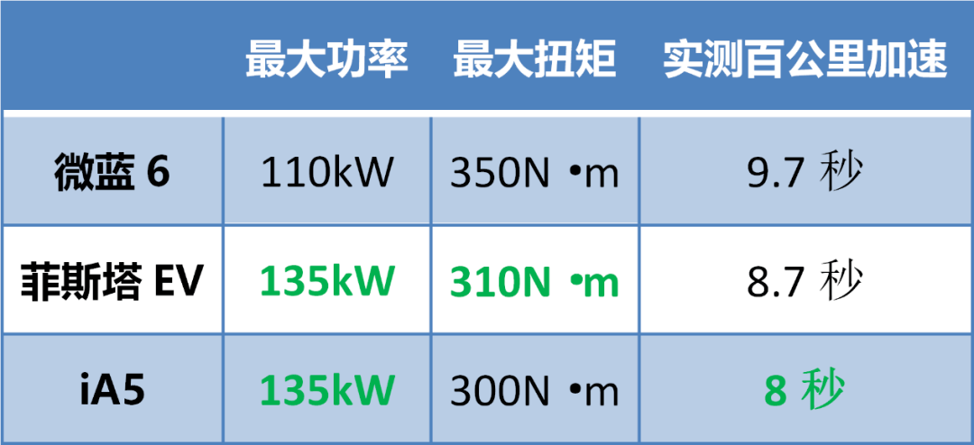 菲斯塔EV的电机总功率是135千瓦,总扭矩310牛米,实测的百公里加速成绩是8.7秒,这个动力勉强凑合,至少在9秒以内了,体感上应该相当于油车的8秒水平。