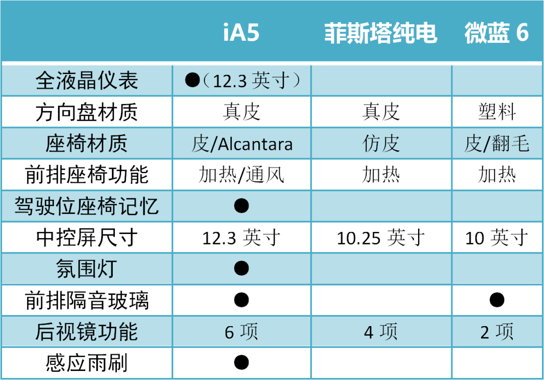 可以发现,iA5的比如说双12.3英寸仪表、皮质和翻毛材质结合的座椅、前排的通风加热座椅、丰云悦享车联网等配置,无不体现了其豪华舒适的取向。相比之下,菲斯塔纯电和微蓝6的配置则要稍微差一些,并且在一些体现舒适性和豪华感的配置上多有缺失。