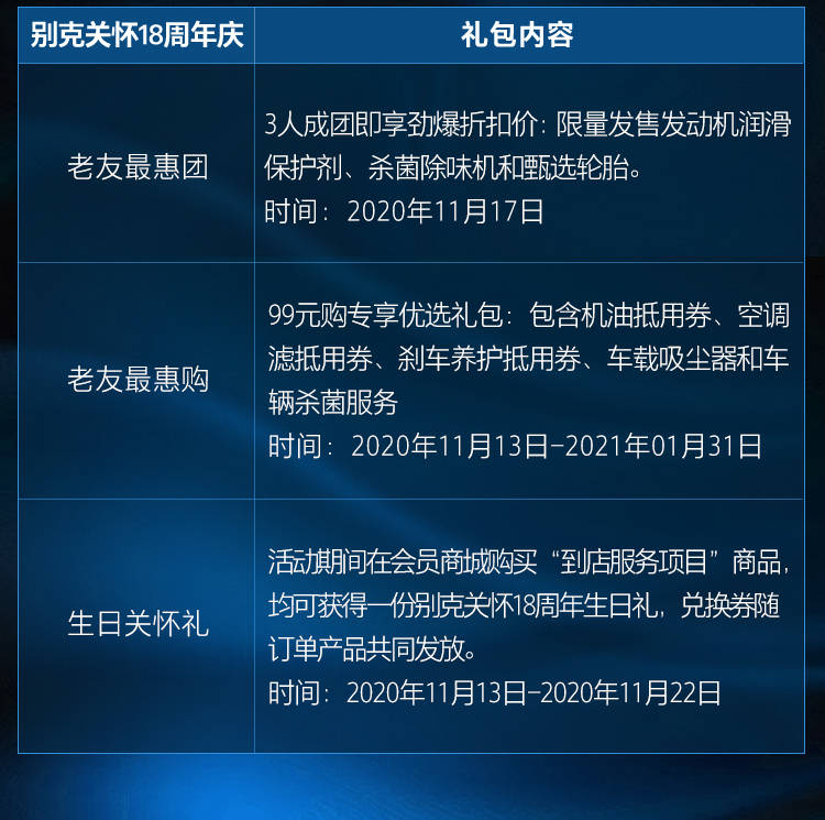 值得一提的是,在18周年庆活动期间,“别克关怀”将为车主解锁多款售后优惠“礼包”。别克车主可通过会员商城(别客汇及iBuick)享受三人团购秒杀礼包和99元专享优选礼包,获得实惠丰富的用车养护产品、抵用券和售后服务。同时,凡在“别克关怀”会员商城购买“到店服务项目”商品的新老车主,均可获赠生日礼,内含神秘精品福利,不容错过。