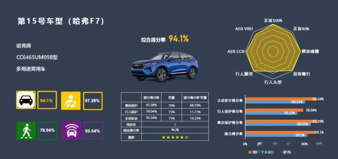 2020年11月24 11:32 来源:蜀锦传媒超五星级安全领航,树立行业新标杆。11月21日,2020年度第三批C-NCAP碰撞测试评价结果正式公布。其中,哈弗F7表现优异,在乘员保护、行人保护以及主动安全方面获得超高评价,最终以94.1%的综合得分率获得超五星级安全,实力领跑同级细分市场。