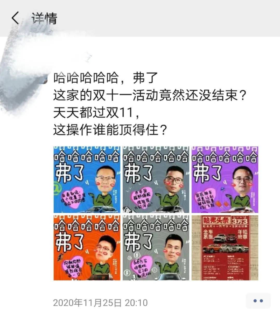 当我还未主动开口,在通屏的朋友圈“广告”信息中,“哈哈哈哈哈,弗了”吸引了我的注意力,毕竟哈弗几大产品总监的大头照,配上哈哈哈的文案,的确是很抓眼球。也好,既然能从朋友圈获取优惠信息,也不用开口去欠人情。
