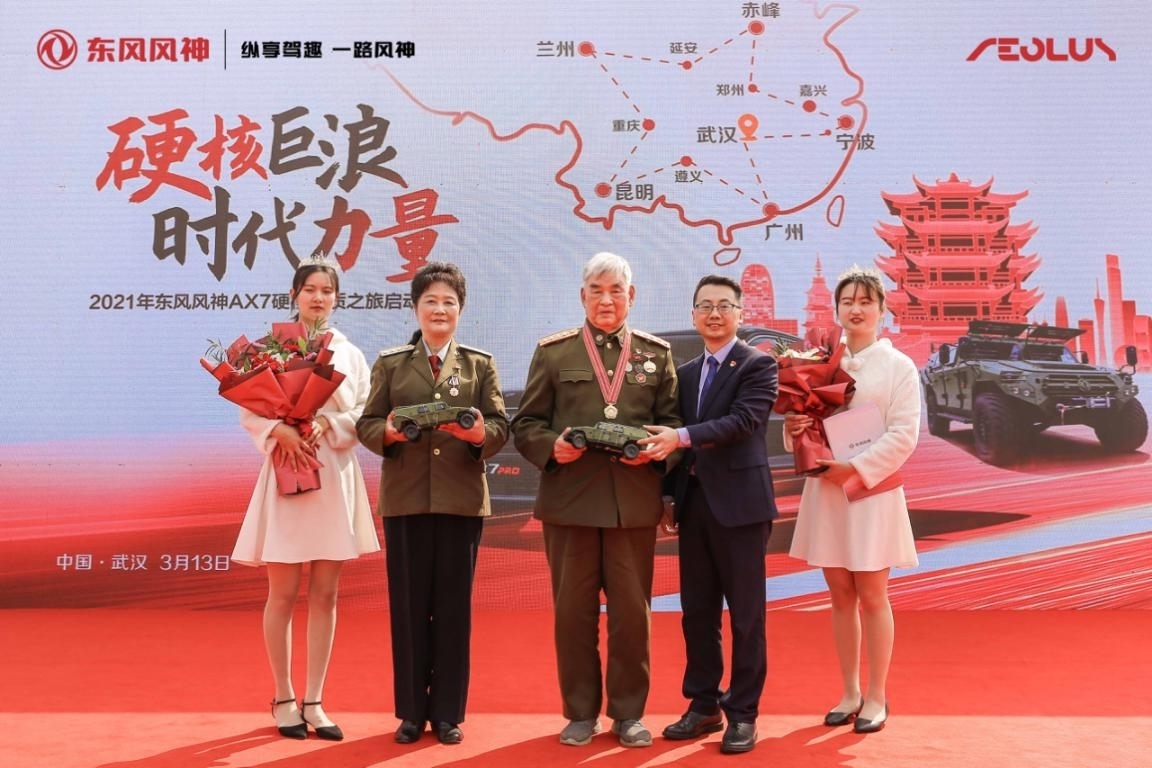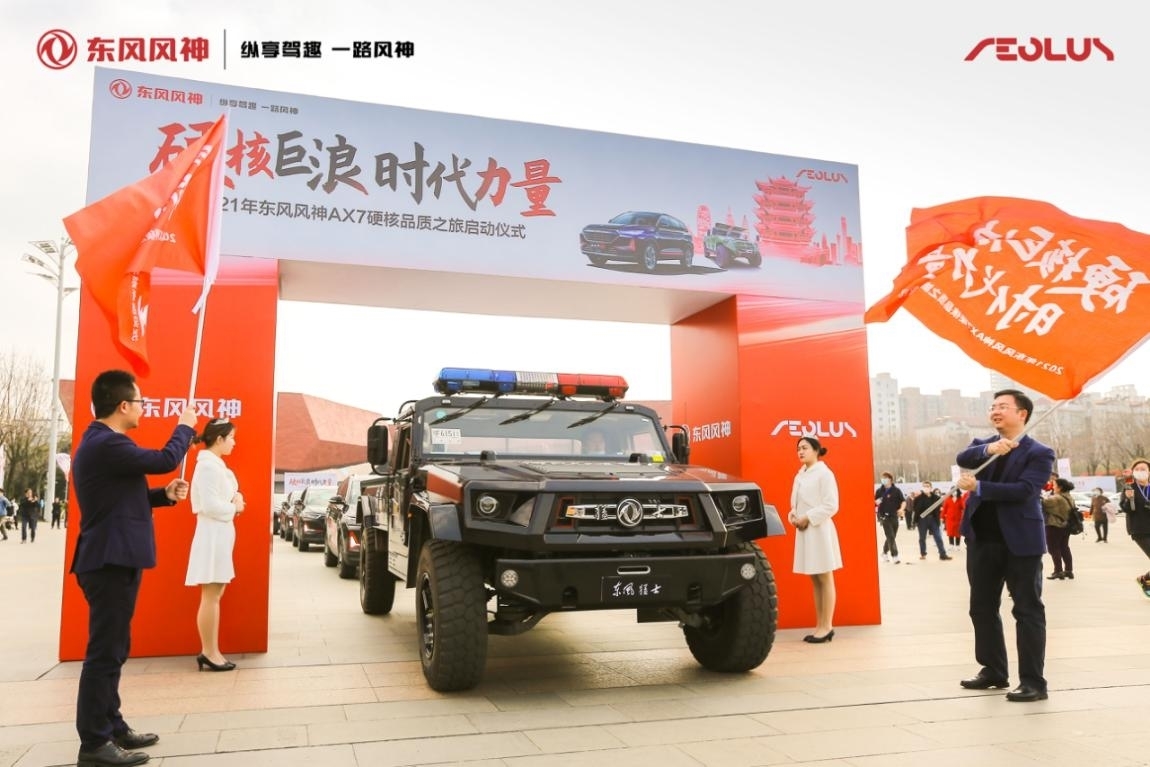 2021年03月19 14:11 来源:蜀锦传媒3月13日,东风风神 AX7硬核品质之旅启动仪式在武汉首义广场举行。东风风神硬核座驾AX7PRO,再次携手“东风猛士”,并肩开启“以硬核巨浪致敬时代力量”的红色之旅。除了来自全国各地风神车主外,由抗美援朝老兵、武汉抗疫英雄和工匠劳模等组成的“巨浪”代表也亮相现场,共同见证品质之旅的荣耀启程。