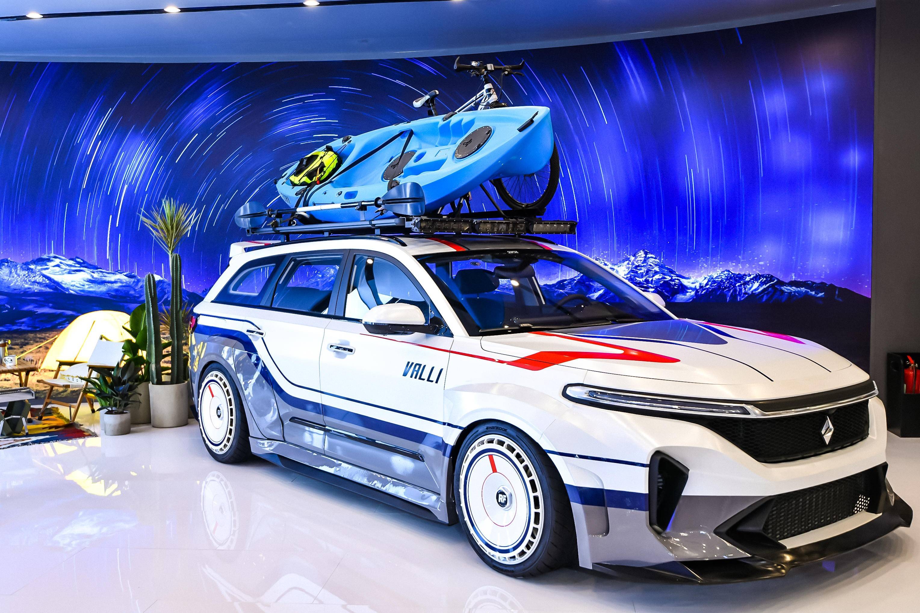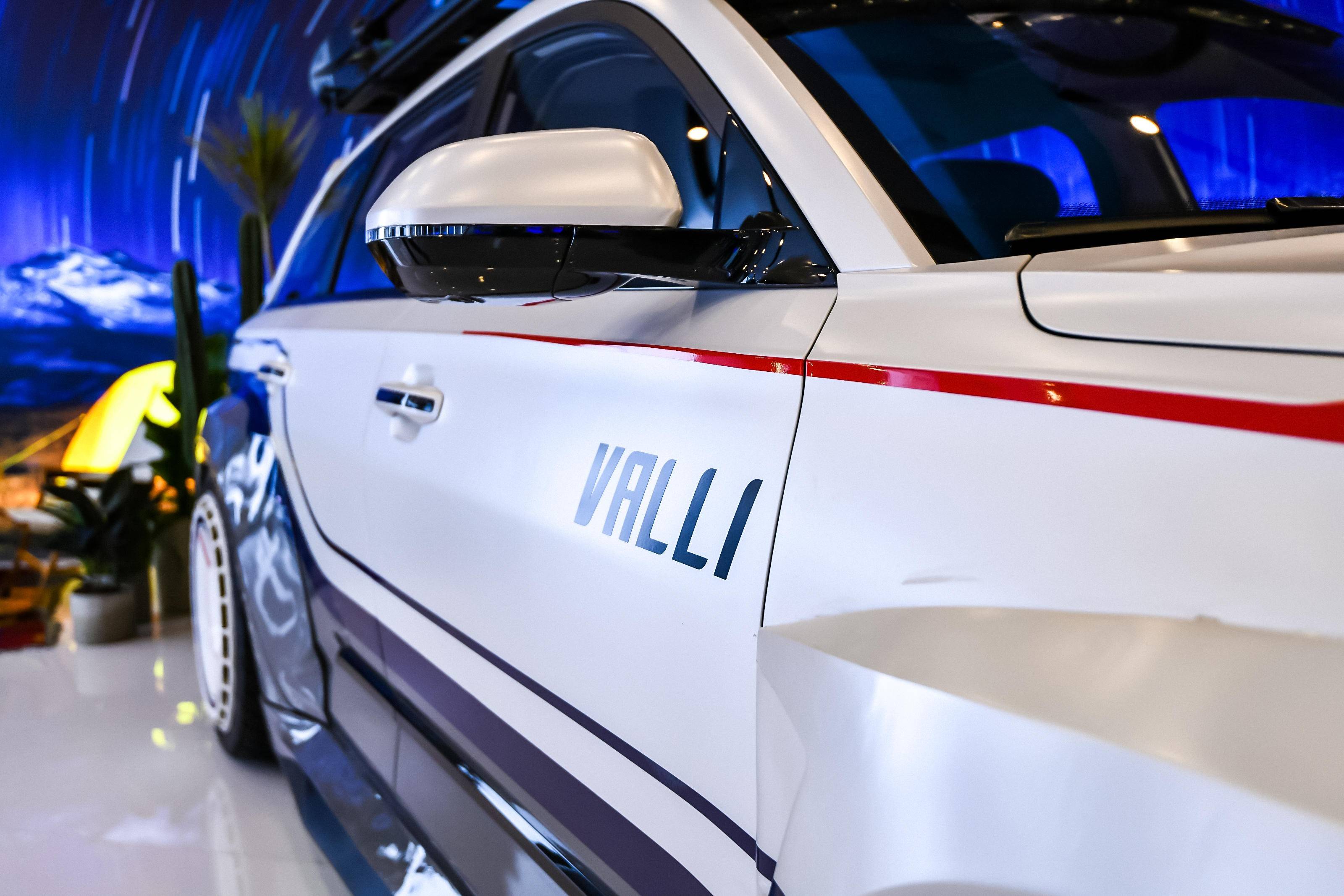 “小白白”车身采用上下分层的亮白与浅灰撞色涂装,配以蓝、红色饰条以及“Valli专属字标,休旅气质展露无遗。全车造型进行低趴设计,前脸加装前铲包围,营造硬朗霸气氛围,带给用户旅途中贴地飞行的炫酷体验。