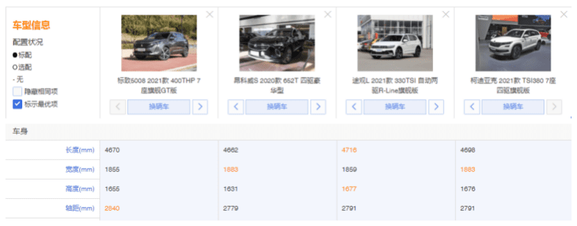 我们再对比其他三款车型。途观L轴距为2791mm,昂科威S轴距为2779mm柯迪亚克轴距为2791mm,显而易见,全新5008的轴距更具优势,毕竟在轴距上每多1cm,都会大大增加乘坐空间,提升乘坐的舒适感。
