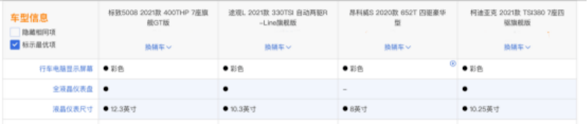 值得一提的是,全新5008液晶仪表配备远优于同级车型,为12.3英寸、途观L为10.3英寸、昂科威S为8英寸,柯迪亚克10.25英寸,中控液晶屏,全新5008达10英寸,途观L为8英寸、昂科威S达10英寸、柯迪亚克9.2英寸;整体来看,全新5008内饰更加高级。