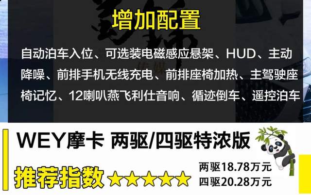 作为WEY摩卡全系入门车型,当我们整理完WEY摩卡标配的配置后还是挺吃惊的,最入门的配置水平就已经超出我们预期了。17.58万元的指导价就可以买到具备L2级别智能驾驶功能的中型SUV了。不过,舒适性和科技配置方面,还是少了一些实用配置,比如座椅加热、主动降噪等。但是,我们对于WEY摩卡入门级别的特香版车型,推荐指数就已经达到了4星,预算紧张的消费者值得考虑。