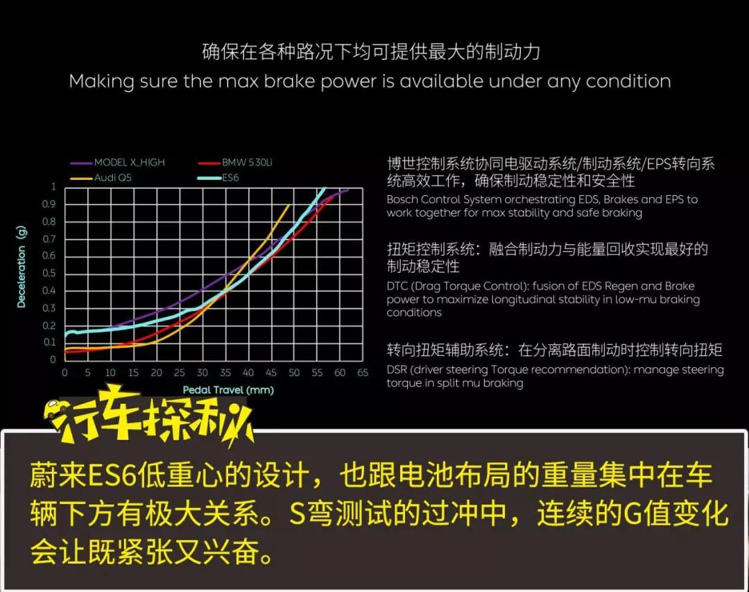 蔚来ES6 的官⽅百公⾥制动距离仅 33.9 ⽶,这对于其中型SUV的车身尺寸和重量来说是非常不错了。制动表现的优异,核心是因为其配备了Brembo 4活塞卡钳和355×32mm通风式刹车盘,再配合博世的i-Booster线控制动系统。这套线控制动系统可以称的上自动驾驶的制动神器,与典型的ESP系统相比,获得所需制动力的速度提高了三倍,并且可通过电子控制系统进行更加精确的调节。
