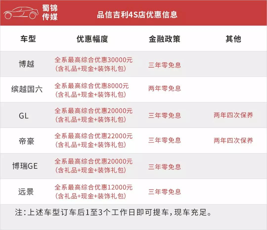 位于三圣乡园区锦江大道上的品信吉利4S店也针对国五库存车型给出了一波给力的优惠,其中博越全系最高综合优惠达3万元,缤越国六车型全系最高综合优惠8000元、吉利帝豪全系最高综合优惠22000元等,具体详情如下: