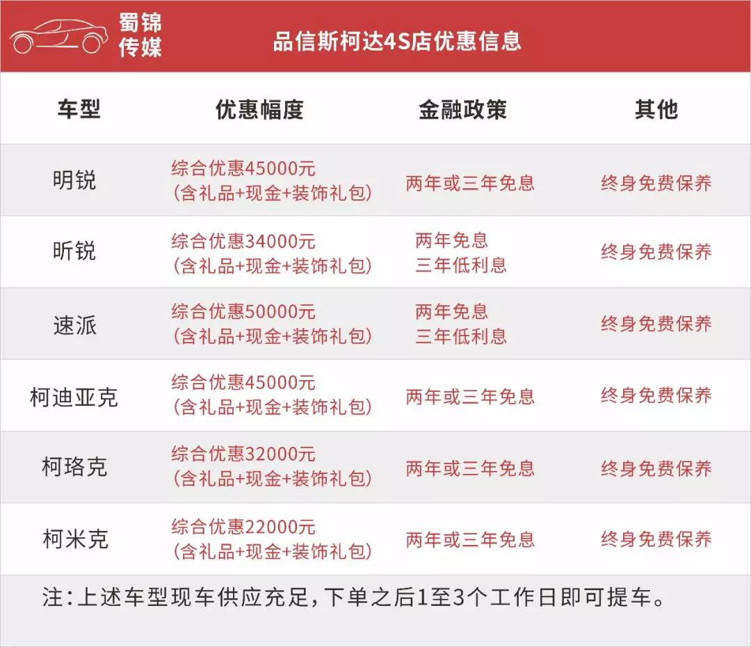 位于三圣乡园区锦江大道上的品信斯柯达4S店也是东门斯柯达品牌的老牌经销商,目前店内在售的明锐、速派和柯迪亚克、柯洛克都是购车客户咨询频率较高的车型,另外该店针对国五车型推出了力度极大的促销措施,最高综合优惠达到了50000元,此外目前购买国五特价车型还可享受终身免费常规保养,具体信息如下: