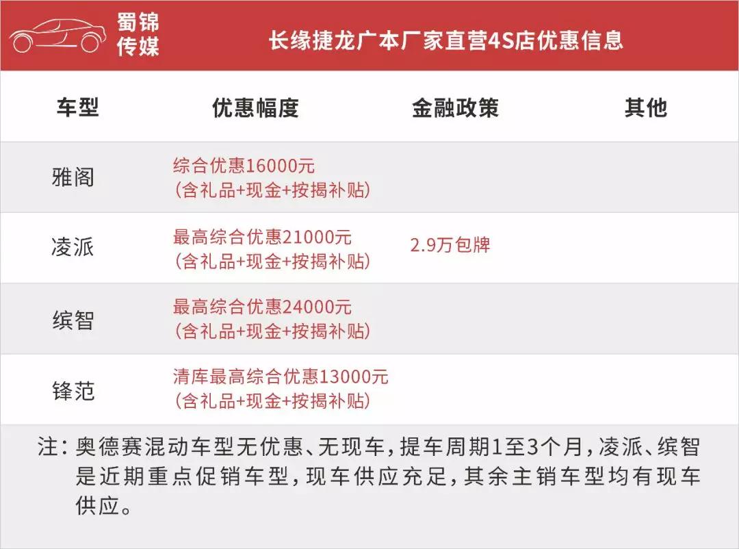 位于东三环三圣乡园区的成都长缘捷龙广本厂家直营店最近也有很多优质的车型优惠信息,比如凌派最高综合优惠2.1万元,另外还有2.9万包牌贷回家的金融购车政策;缤智最高综合优惠2.4万;锋范清库最高综合优惠1.3万元,具体如下: