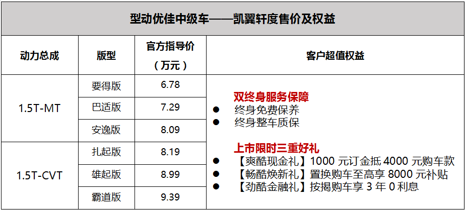 在价格与权益环节,凯翼也给出了与年轻消费者交友的极大诚意,提出购车“双终身”用车保障,让消费者安心购车,用车无忧。