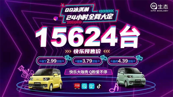 此次活动邀请虎哥说车、车坛老炮儿与8城网红同步直播、连线,开播4小时,累计观看人数超过100W,互动量更是超过800W,24小时全网大定15624台,刷新了汽车电商直播新记录。奇瑞QQ冰淇淋再次成功出圈,引爆全网流量热点。