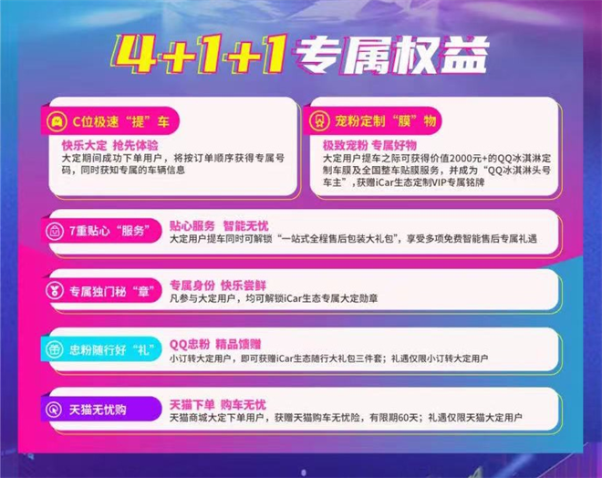 此次QQ冰淇淋还推出了4+1+1的专属权益,4项通用权益好礼,拥有优先提车特权、定制车膜、贴心服务、专属勋章等。针对参与小订且参与大定的用户,还有出行大礼包奉上,如果是在天猫官方旗舰店参与的用户,还能享受15天退换,60天有效期的无忧服务。实现了用户权益的全面升级,轻松买车无负担,快乐用车更省心。美丽的价格+贴心的升级服务引爆全网流量,成功出圈。