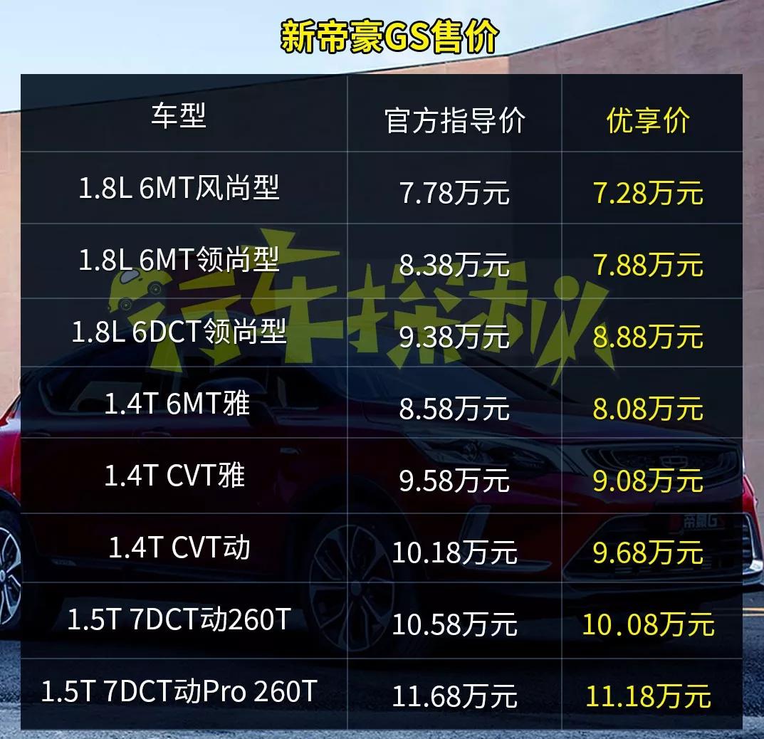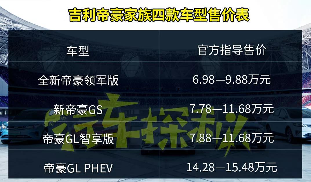 其中帝豪领军版指导售价为6.98万-9.88万元,帝豪GL智享版指导售价为7.88万-11.68万元,帝豪GL PHEV指导售价为14.28万-15.48万元,新款帝豪GS指导售价为7.78万-11.68万元。