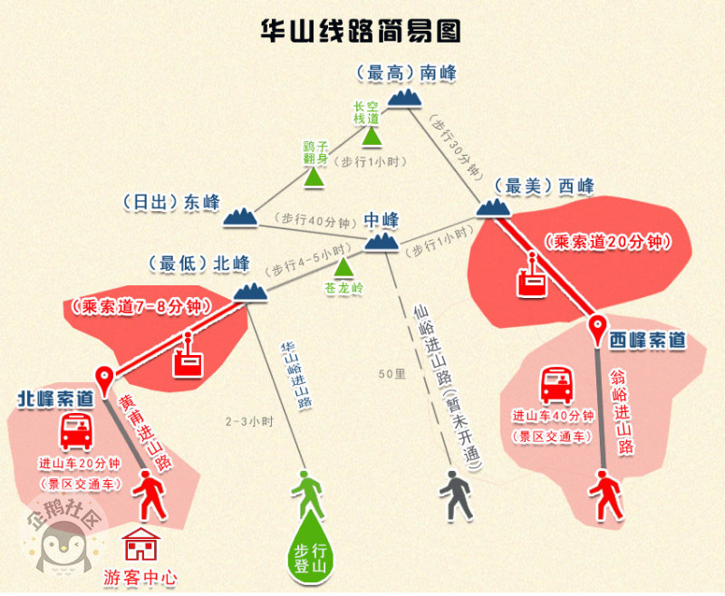 虽说“自古华山一条道”,但因为西峰和北峰都有索道,所以上下的选择还是很多的。具体的线路大家可以参考图片,我给总结一哈价格。