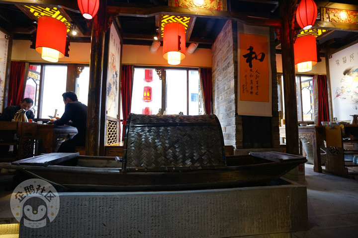木凳木椅,小桥流水,这艘船起到了画龙点睛的作用。