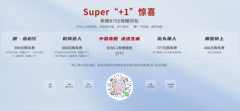 一汽奔腾还采用时下年轻消费者所钟爱的“拆盲盒”形式,为购车用户带来Super“+1”惊喜。用户通过“闷包星球”小程序,参与闷包抽取,到店试驾即可领取明星朱亚文签名照以及电影票2张(1000套)。同时,“奔腾B70S锦鲤闷包”分为“中国奔腾 虎虎生威”、“颜·出必行”、“时尚达人”、“街头潮人”以及“摩登初上”五大主题,包含奔腾B70S 一年使用权、李宁球包和服装、儿童安全座椅,更有666元-999元超值购车券、奔腾B70S剧本杀试驾名额、奔腾B70S新车底护板等“豪”气惊喜,订车用户随机抽取其一,可喜提更多福利,一汽奔腾实力宠粉在行动!